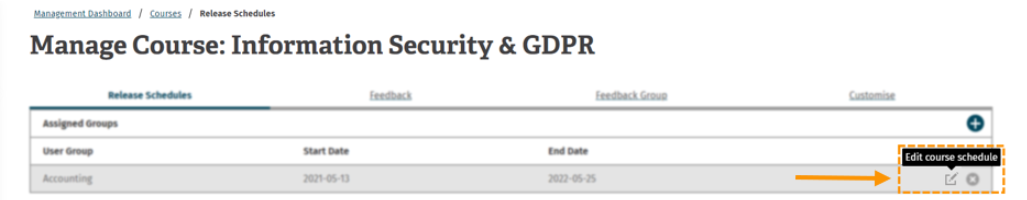 To change the release schedule for a particular user group, you first need to find the group you wish to edit the release schedule for in the table, and click on the Edit icon at the far right of the user group’s row.